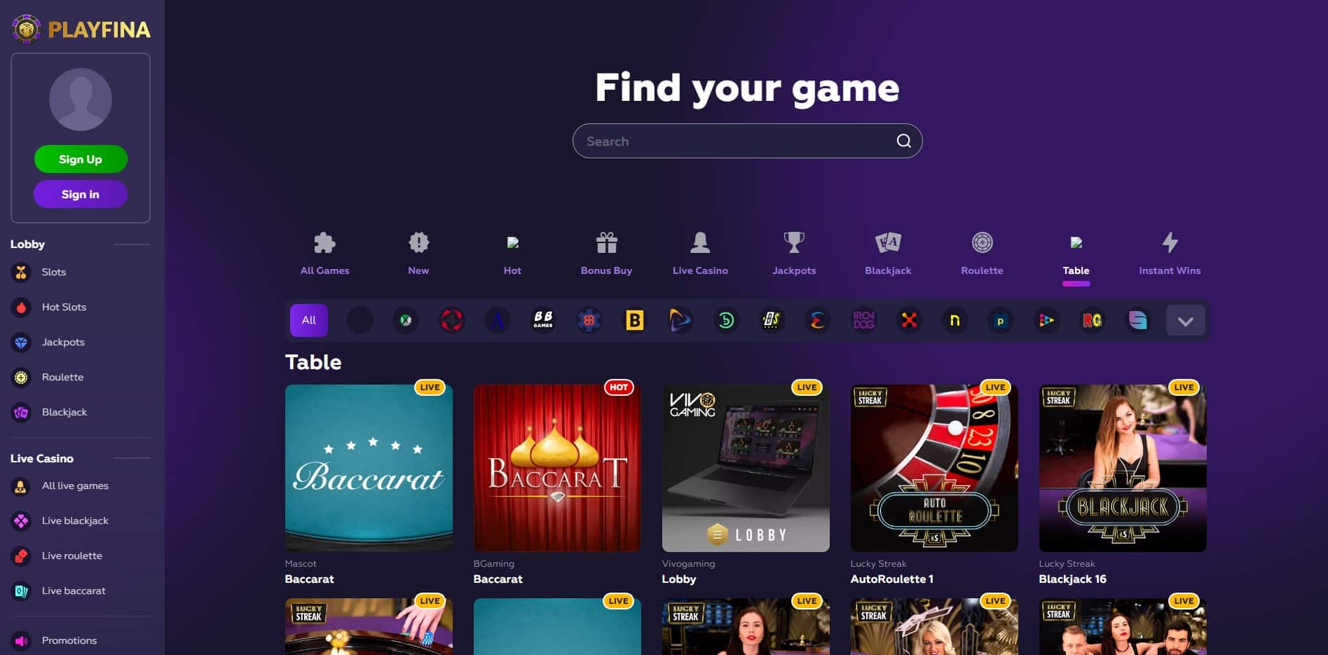More than 11,000 slots, all varieties of blackjack, dozens of roulette games, craps, video poker, and other games are available to you at Playfina casino online Enhance Your Gaming Experience by Creating a Playfina Account and Connecting with Global Gamers! Play the Best Online Casino Games at Playfina ✓ Try Slots, Blackjack, Roulette, Craps and Video Poker with Huge Bonuses. Playfina Casino How to Start Up to 1000€ + 200 FS + Secret Bonus... Playfina Casino - Bonus Codes – 50 Free Spins!